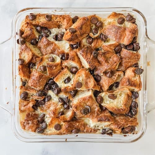 - When in doubt, add more croissants. The dish may seem full, but croissants are very airy, so once you pour the custard, they will deflate a bit. I always stuff in a few extra croissant pieces to fill in all the gaps!