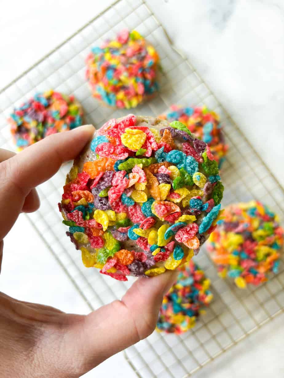 - Once cooled, dip the tops of the cookies in the glaze followed by the Fruity Pebbles cereal. Let them sit for a few minutes to set and enjoy!
